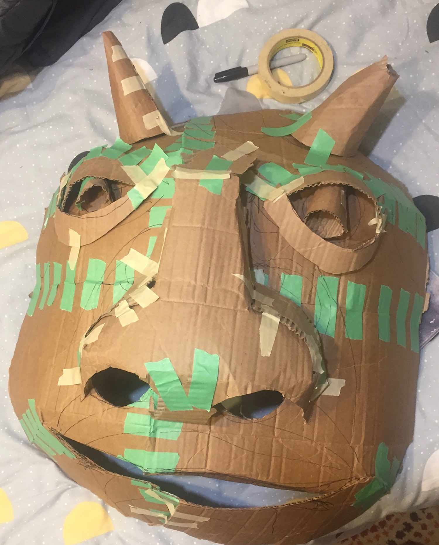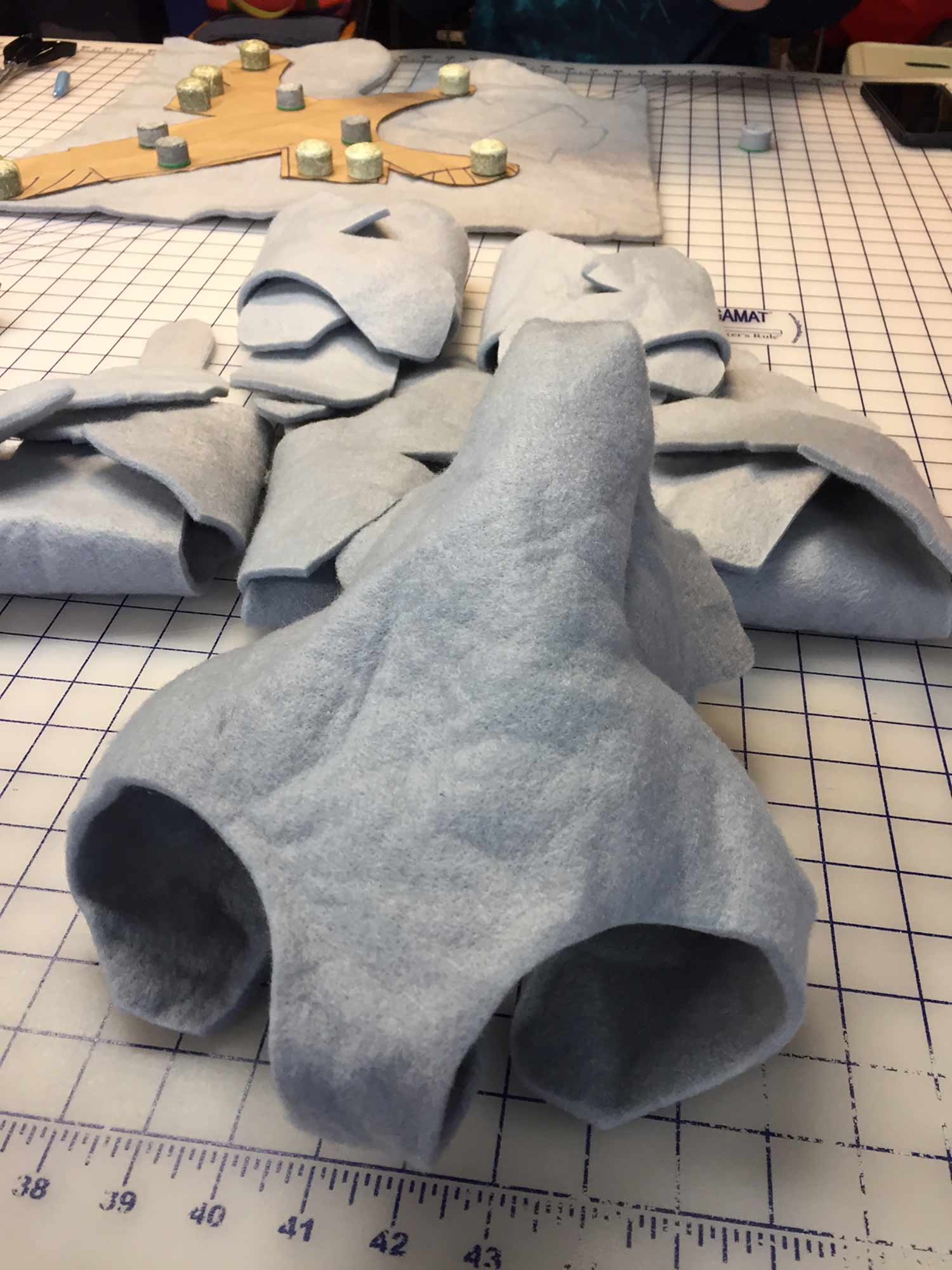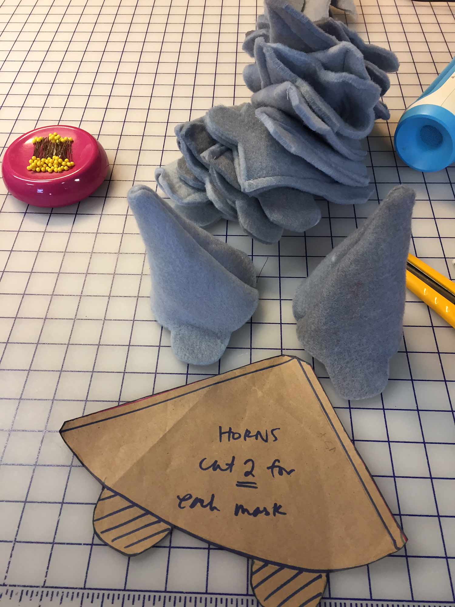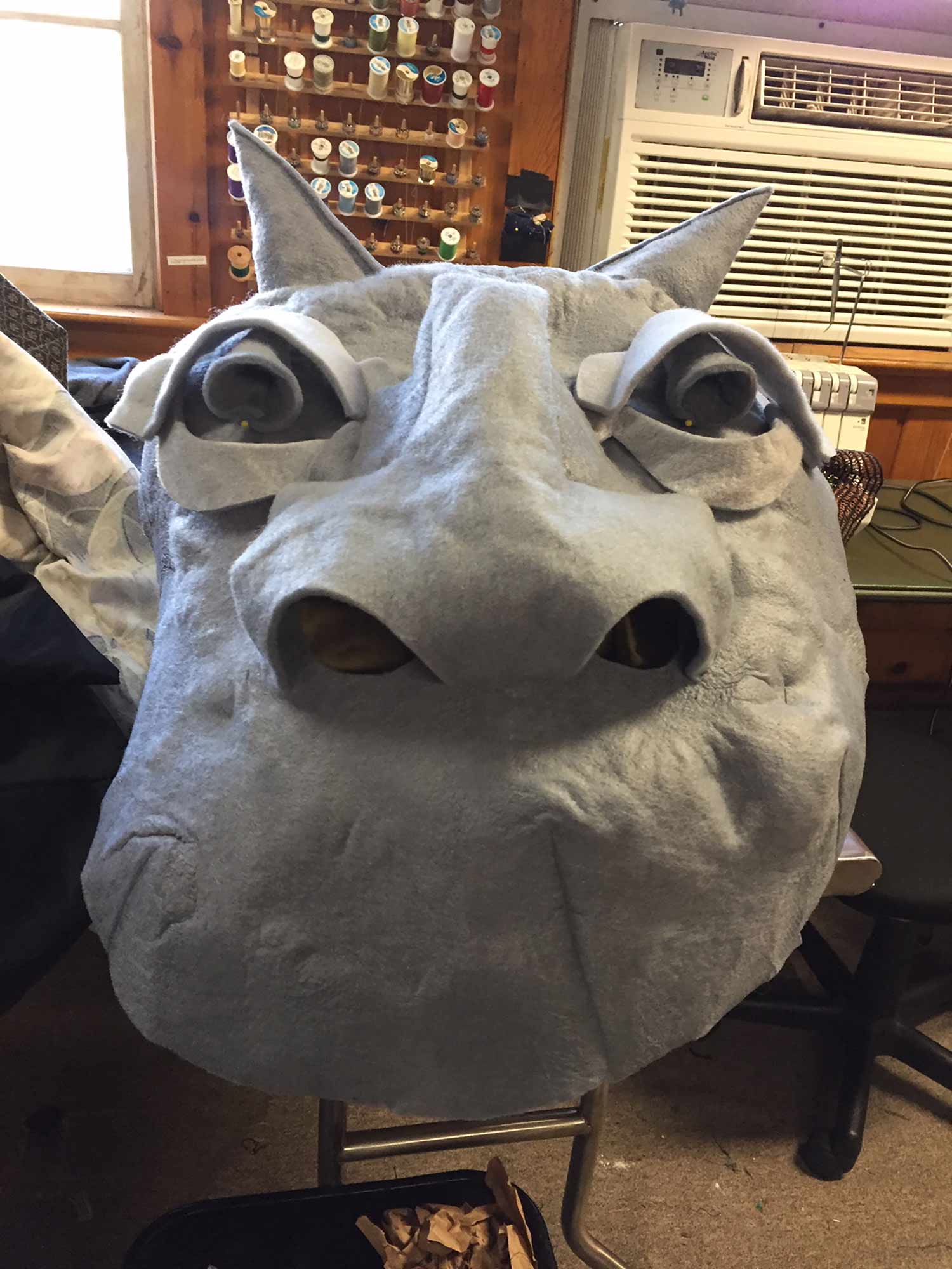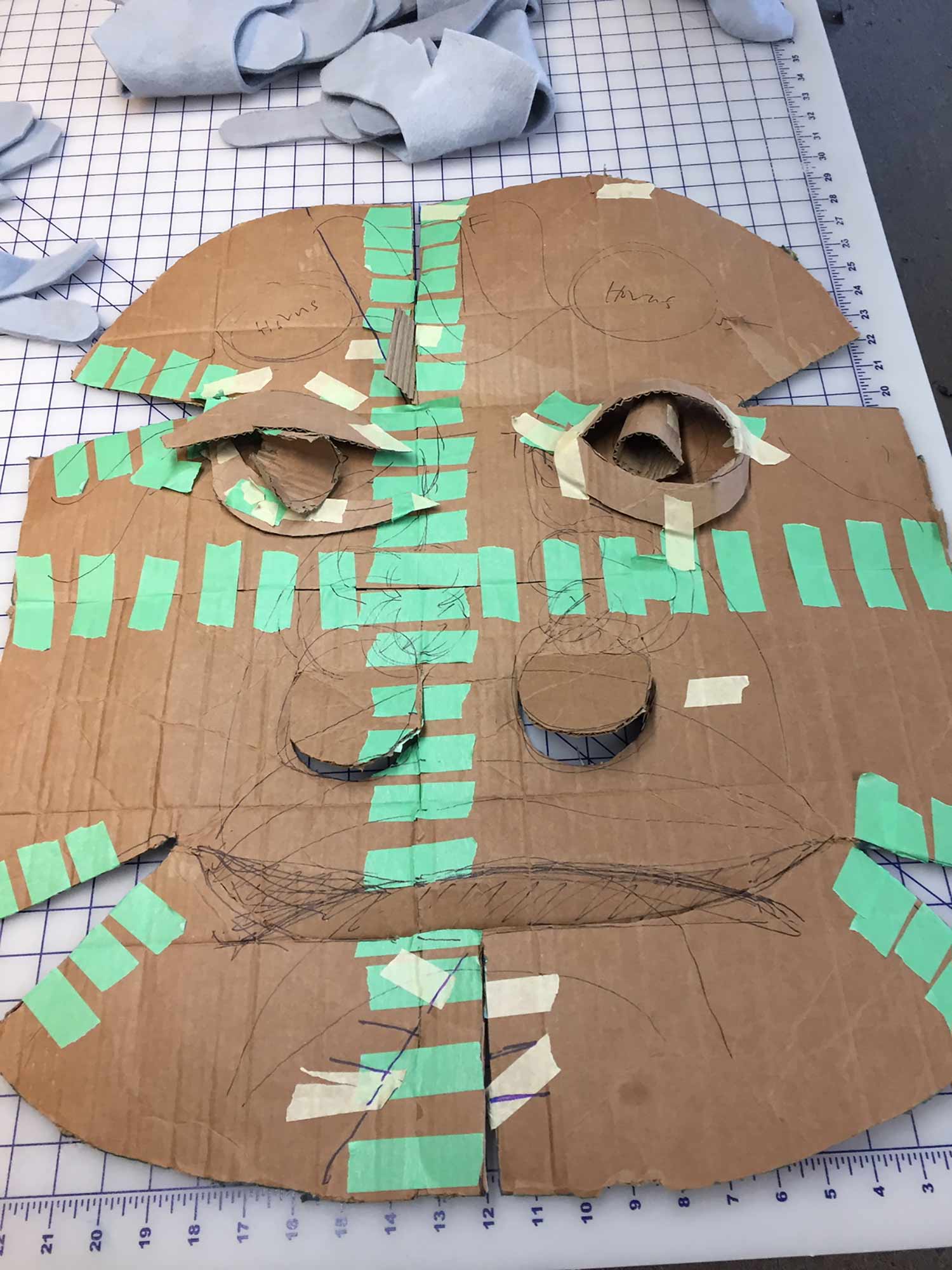 Pei Lee, the costume designer for The Amateurs, took inspiration from her own designs from The Little Mermaid, which Olney Theatre Center produced in 2014. For Ursula’s headpiece, she used a material called Fosshape, which is a non-woven fabric that molds and hardens when it is exposed to heat. She used this same material to make the masks in The Amateurs, and this fabric was perfect for this task.