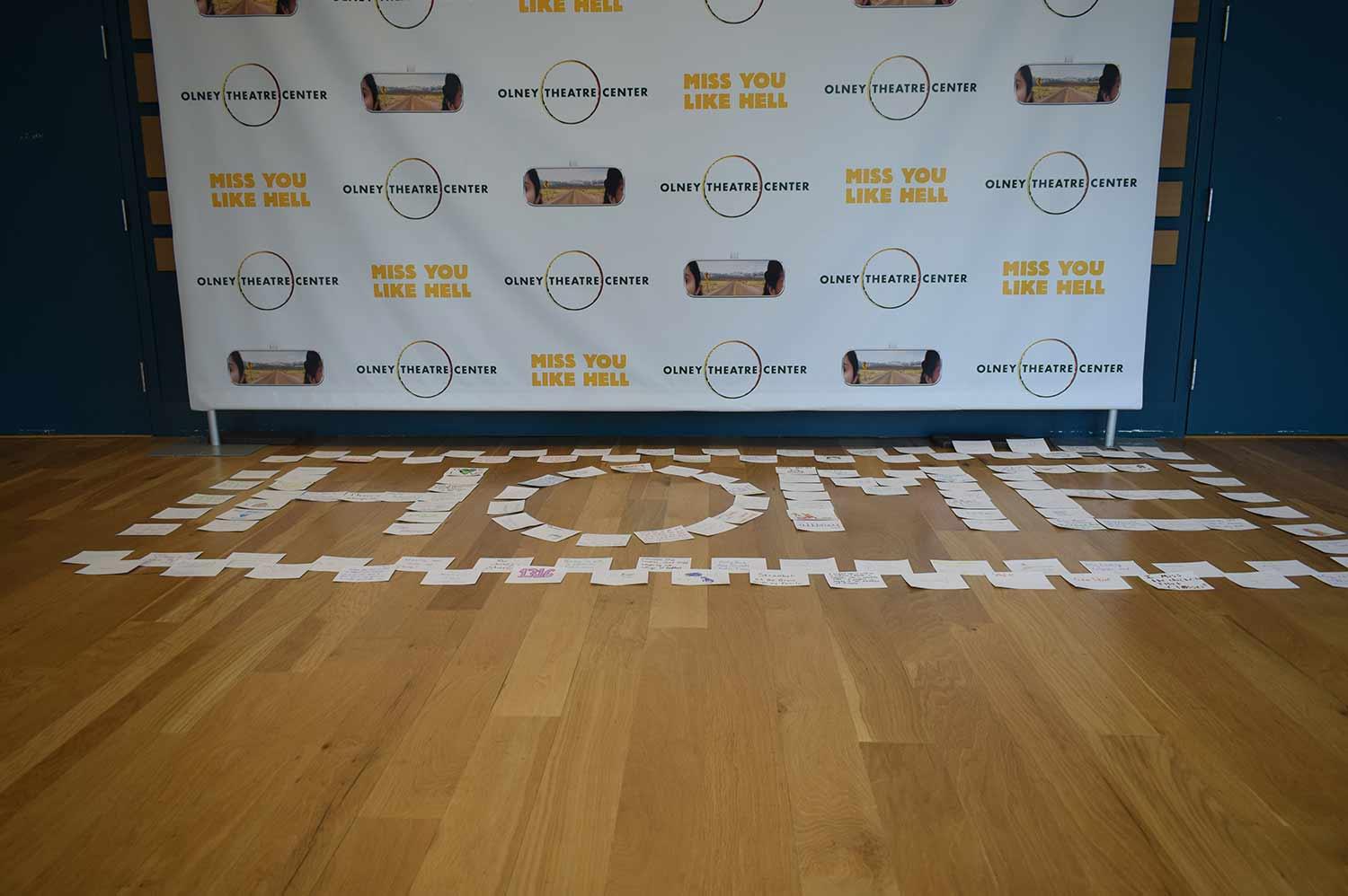 My mother recently saw Miss You Like Hell, which had its closing performance this past Sunday, and she said that she came out of the theatre with tears in her eyes. She expressed to me that the thought of someone separating her from her daughter would break her. My mother saw the last scene in the show where Beatriz and Olivia were standing on opposite sides of the wall, and she put herself in their shoes. Unfortunately, this is a devastating reality for many individuals. For lots of us, family means home. Home is where you feel accepted, loved, and valued. In Miss You Like Hell, home becomes a major theme. Therefore, Olney Theatre Center devised community engagement events that focused on what home means to members of our community. Our Community Engagement and Touring Coordinator, Rebecca Dzida, and Education Administration Apprentice, Hannah Ensign, worked together to devise an all day, open house called “Miss You Like Home” that showcased a wonderful array of local artists and community members whose everyday work reflects the themes of the show. Along with this event, we placed cards in our lobby that asked people to write down what home means to them. These cards stayed in the lobby throughout the entire run of Miss You Like Hell. Audience members of all ages filled them out, and we found that home means many different things depending on the person. For one person, home meant hot cocoa and movies. For another, home included Olney Theatre Center. When I asked Hannah what inspired this idea of the lobby cards, she responded: “We wanted to incorporate a physical representation of what home means to people. Also, the cards are a way for our patrons to connect with the themes of the show on a deeper level. I think asking people to think about what home means to them was another way to think about what the characters in the show were going through, and that, while not everyone experiences what Beatriz and Olivia did, many of the themes are universal.” Along with this, Rebecca mentioned that the cards allowed the community to take ownership of the space and create an art project together. Even though the cards are no longer in the lobby and Miss You Like Hell has closed, Olney Theatre Center is very much home to many of our audience members, staff, and artists.