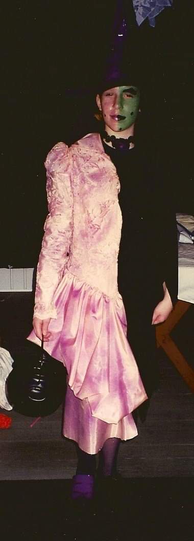 The year was 2000. Keeping up with my desire to be abnormal things for Halloween, twelve year-old me decided to be a Half Good Witch/Half Bad Witch. The left half of the dress was a regular witch's dress, the right half was a ridiculous prom dress that my mom and I found in the thrift store. We cut the prom dress up the middle and sprayed it with purple spray paint accents. My right shoe was purple as well as my nails on my right hand. The make-up was fabulous, of course 🤣. The best part was confusing the people who saw me trick or treating.