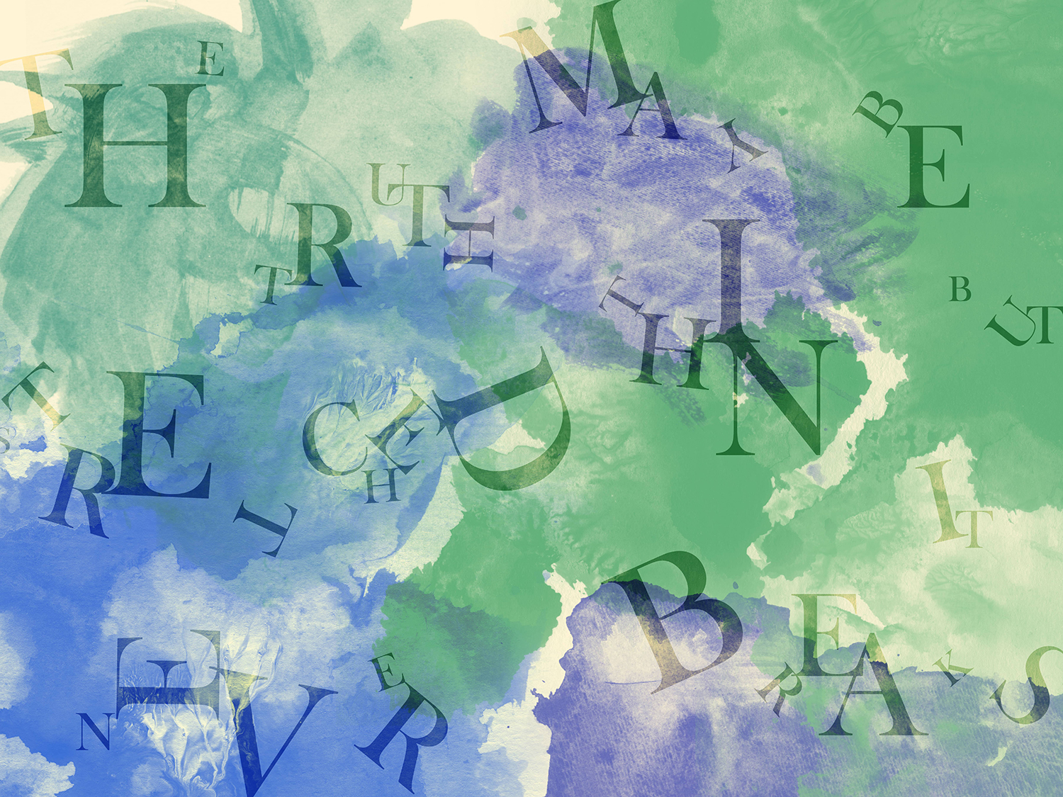 The bright white pages of the book looked jarring behind the cake illustrations, so it was decided to add some imagery. A traditional page of text didn’t quite fit the aesthetic, so Peter, Milagros, and I chose to liven it up by distorting the words and introducing color. Using Photoshop, I manipulated a collection of letters and overplayed scans of watercolor brush strokes. (A fun easter egg: the text on the pair of pages actually spells out a quote from Don Quixote: “The truth may be stretched thin, but it never breaks”)