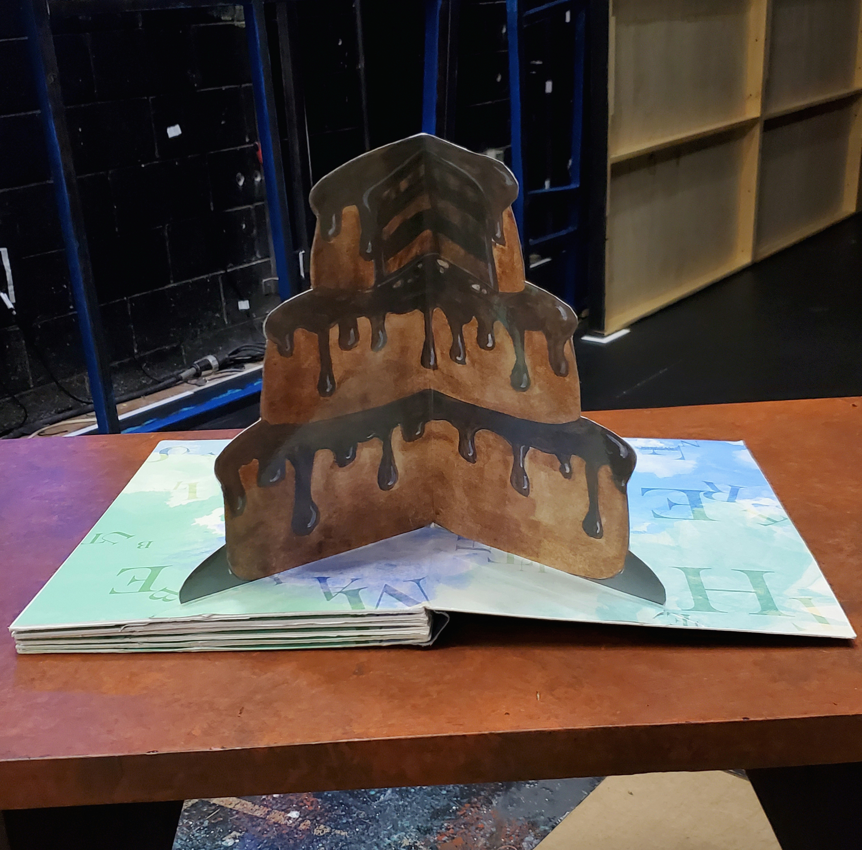 Instead of going the traditional route and making a giant edible cake, our director Peter Flynn decided to go in a different direction. Olney’s production takes place in a giant library and celebrates the power of Matilda’s imaginative storytelling. What if this fantastical cake came from a book? Peter wanted to explore using pop-ups as a way to communicate this moment. When the book is first opened, it would reveal the whole cake. With each successive page turn, the cake would get smaller and smaller.